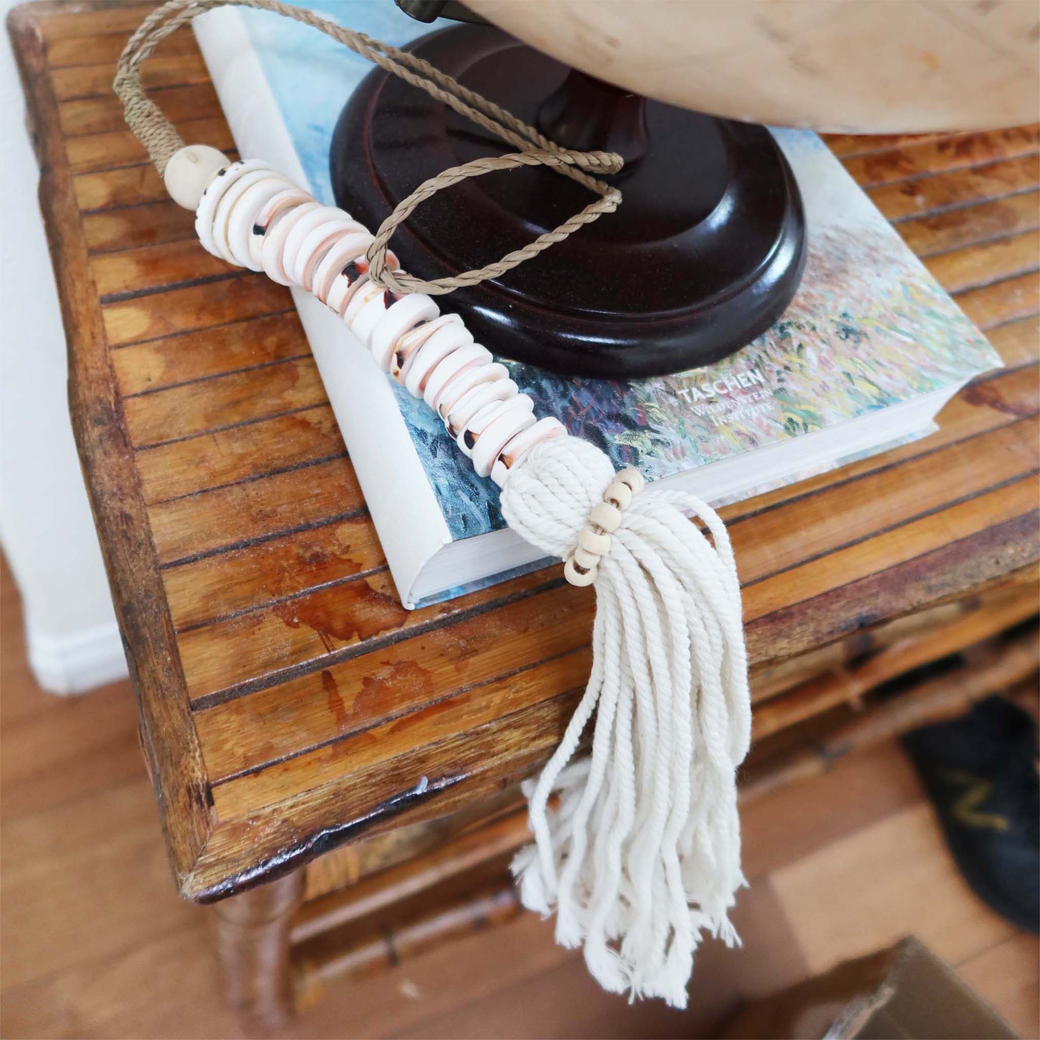 Bring a touch of coastal elegance to your space with our Medium Size Seashell Tassel Décor. Handcrafted by artisans in Indonesia, this boho-chic piece combines natural materials like seashells and soft tassels to create a beautifully textured and versatile decoration. Features real seashells and handwoven tassels for an authentic, coastal look. Handmade by skilled Indonesian artisans, ensuring every piece is unique. Perfect for showcasing in your tray, your shelf or as a statement piece in entryways. Adds a laid-back, tropical vibe to any space, boho chic vibe Just the right size for easy integration into various décor setups. Made with sustainable materials, supporting traditional crafts in local communities. Elevate your home décor with this elegant, beach-inspired piece, perfect for creating a serene, bohemian ambiance. Material: Seashell Size : 28.3" x 1.18" inch Care: Spot clean